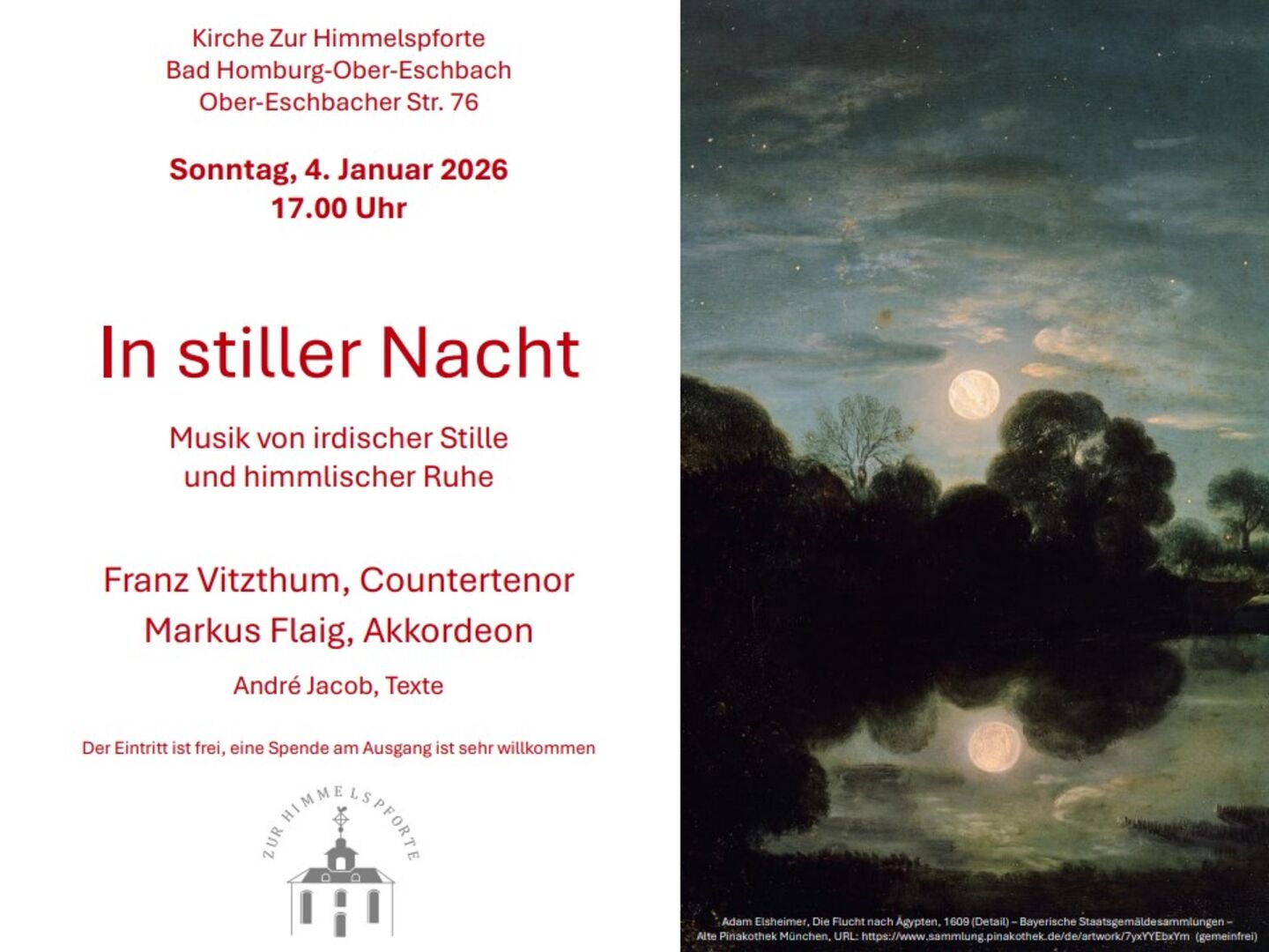 Der international renommierte Countertenor Franz Vitzthum und Markus Flaig am Akkordeon interpretieren unter dem Titel „In stiller Nacht“ Musik unterschiedlichster Epochen: Der Bogen spannt sich von kunstvollen Motetten der Renaissance über Werke von Bach, Schubert, Brahms, Debussy und Poulenc bis zu Stücken der amerikanischen Komponistin Prof. Joanne Metcalf, die eigens für Franz Vitzthum Hohelied-Texte neu vertont hat. Die beiden Künstler führen moderierend durch das Programm des Abends. André Jacob wird dazu ausgewählte Texte lesen.