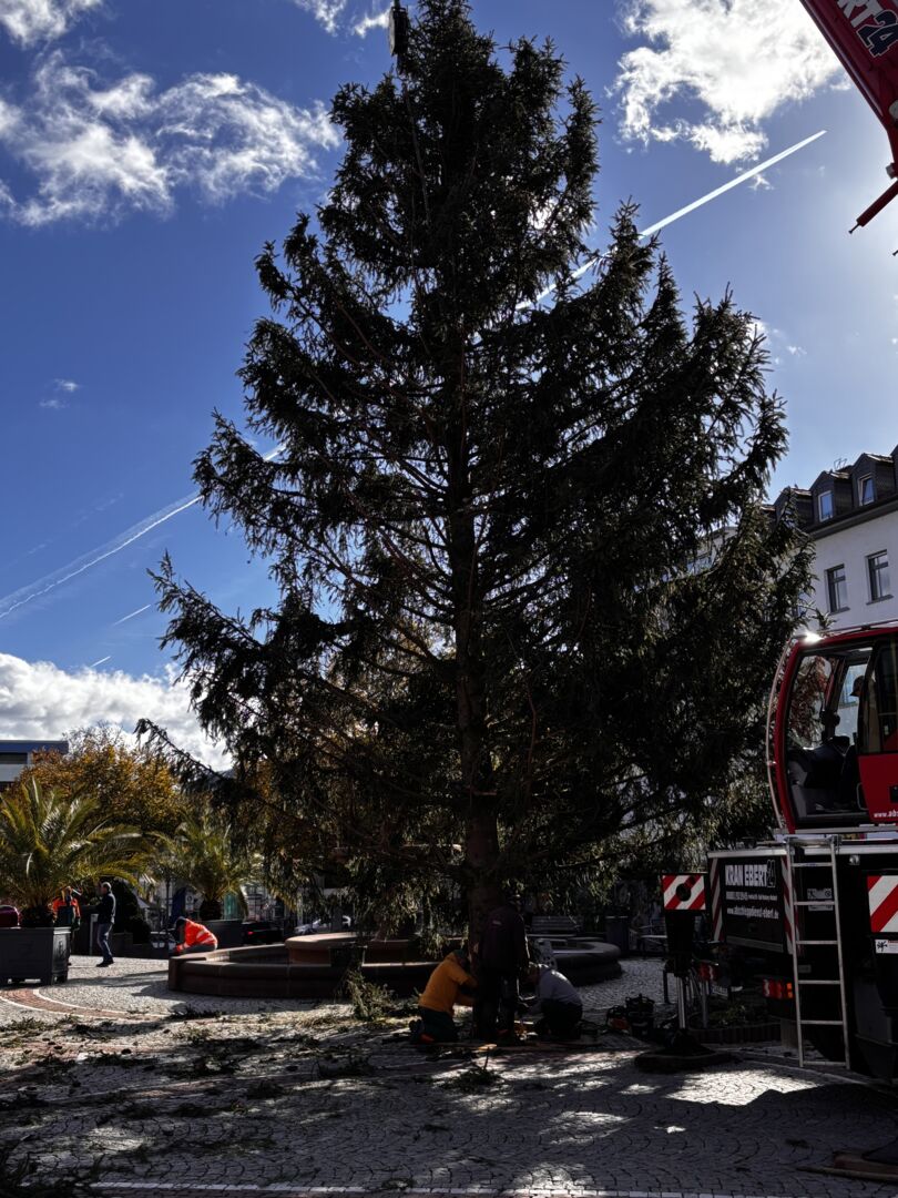 Bad Homburg v. d. Höhe. Er (oder sie) ist 40 Jahre alt, rund 18 Meter hoch, bringt stolze vier Tonnen auf die Waage und stammt aus dem Vogelsberg – genauer gesagt aus der Nähe von Rudingshain: Bad Homburgs Weihnachtsbaum ist auf dem Kurhausvorplatz angekommen. Ein untrügliches Zeichen, dass die Adventszeit vor der Tür steht. Am Donnerstag, 30. Oktober 2025, hatte die schöne Rotfichte ihre eineinhalbstündige Anreise absolviert und wurde vor dem Kurhaus von der Horizontalen in die Vertikale gebracht. Ausgewählt wurde sie von Betriebshof-Mitarbeiter Thilo Kappus, der gemeinsam mit der Fritzges Forstwirtschaft für das Fällen, den Transport und das fachgerechte Aufstellen verantwortlich zeichnete – ein Zusammenspiel von Erfahrung, Präzision und Teamarbeit. In den kommenden Tagen werden dann noch die LED-Leuchtstränge mittels Wickeltechnik (um die Äste gewickelt) angebracht. „Jetzt kann die Adventszeit kommen“, freut sich Oberbürgermeister Alexander Hetjes.